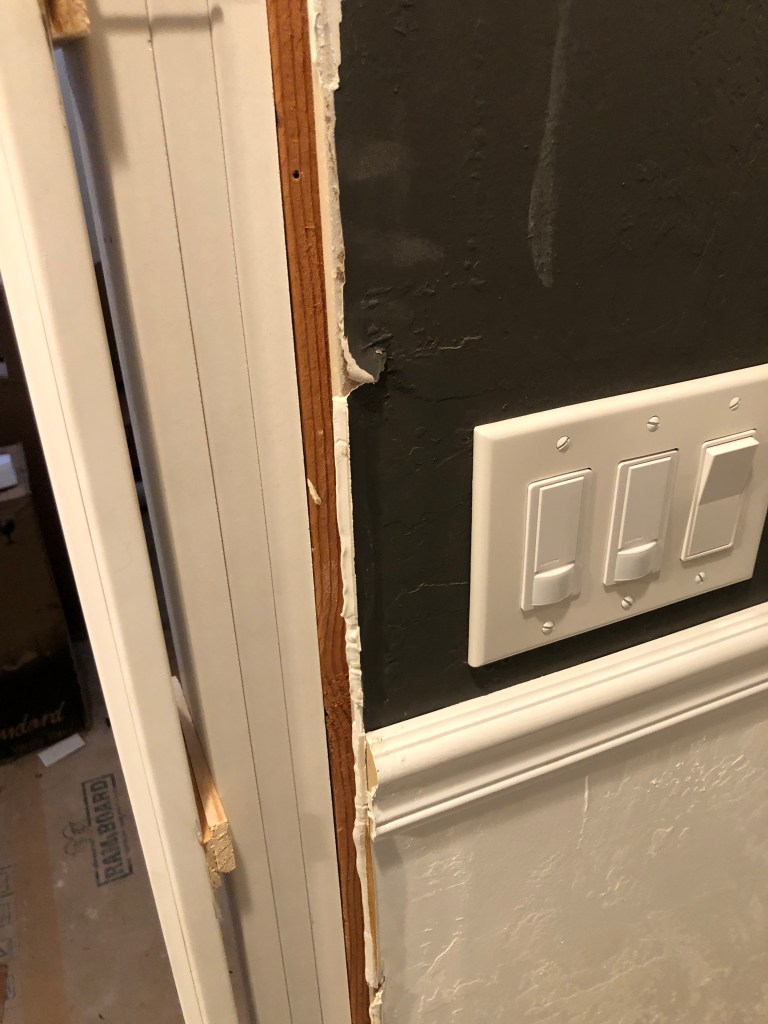 I discussed with the contractor when deciding on the trim style and decided to go with a 3 inch window/door trim instead. This would allow most of the doors and windows to look symmetrical at least. I am pretty sure I told him, just to leave the old trim in the entry and the living room and transition to the new trim size in the rest of the house… but of course he started ripping out ALL of the old trim. I get that it is nice to have everything match, but every time you change something, it seems to cause other problems!! Now since the new trim is smaller we have to patch all the walls that wouldn’t have had to be patched.